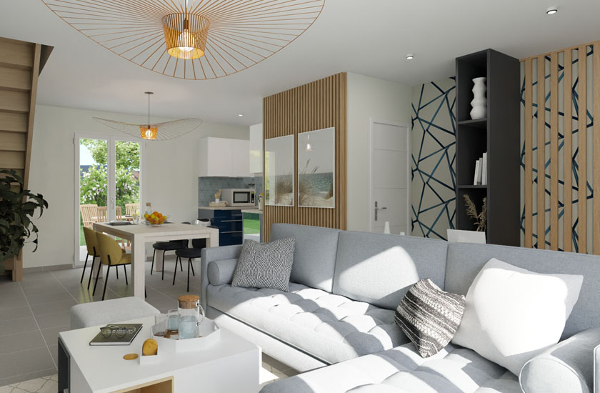 ECLAT est une maison à étage d’une surface totale de 90 m2. Elle est construite sur vide sanitaire et propose au rez-de-chaussée un séjour-cuisine de 35 m2, un WC et d’un garage intégré de plus de 13 m2 donnant accès cellier. L’espace nuit se situe à l’étage. Il se compose de 3 chambres de plus de 9 m2, d’une quatrième chambre avec dressing pour une surface totale de 12,5m2 et une salle de bains avec possibilité d’installer en option un WC. A noter, le garage est compatible avec un futur aménagement intérieur (hors point d’eau). Les menuiseries sont en PVC de couleur blanche, les volets sont quant à eux en bois prépeints en blanc. Plusieurs couleurs d’enduit extérieur sont proposées.
