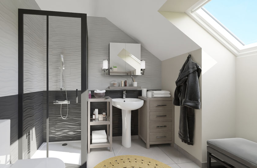 Cette maison à combles aménagés d’une surface totale de 76 m2 est construite sur vide sanitaire. Elle propose au rez-de-chaussée un séjour-cuisine de 34 m2, un WC et d’un garage intégré de plus de 14 m2 donnant accès à l’entrée de la maison. L’espace nuit se situe à l’étage. Il se compose de 3 chambres de plus de 9 m2 et d’une salle d’eau avec possibilité d’installer un WC. A noter, le garage est compatible avec un futur aménagement intérieur (hors point d’eau). Les menuiseries sont en PVC de couleur blanche, les volets sont quant à eux en bois prépeints en blanc. Plusieurs couleurs d’enduit extérieur sont proposées.