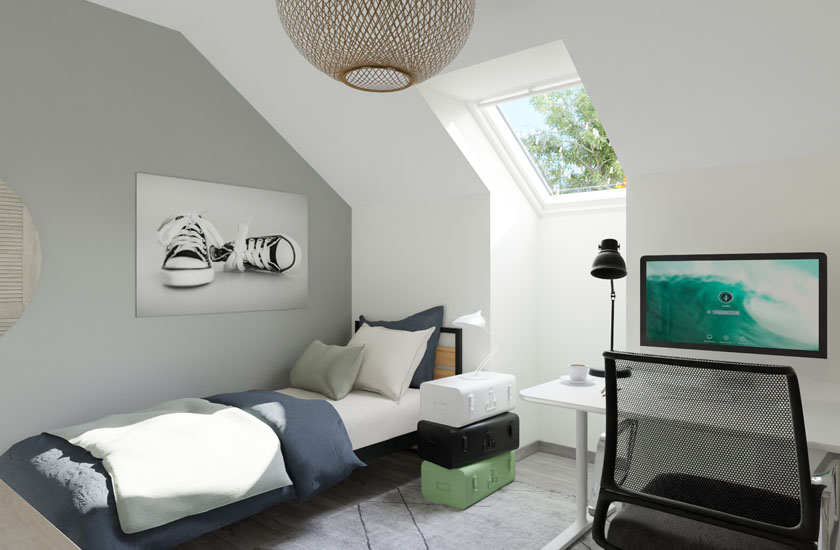 Cette maison à combles aménagés d’une surface totale de 76 m2 est construite sur vide sanitaire. Elle propose au rez-de-chaussée un séjour-cuisine de 34 m2, un WC et d’un garage intégré de plus de 14 m2 donnant accès à l’entrée de la maison. L’espace nuit se situe à l’étage. Il se compose de 3 chambres de plus de 9 m2 et d’une salle d’eau avec possibilité d’installer un WC. A noter, le garage est compatible avec un futur aménagement intérieur (hors point d’eau). Les menuiseries sont en PVC de couleur blanche, les volets sont quant à eux en bois prépeints en blanc. Plusieurs couleurs d’enduit extérieur sont proposées.