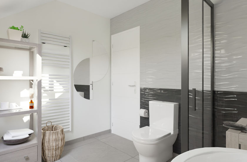Cette maison à combles aménagés d’une surface totale de 76 m2 est construite sur vide sanitaire. Elle propose au rez-de-chaussée un séjour-cuisine de 34 m2, un WC et d’un garage intégré de plus de 14 m2 donnant accès à l’entrée de la maison. L’espace nuit se situe à l’étage. Il se compose de 3 chambres de plus de 9 m2 et d’une salle d’eau avec possibilité d’installer un WC. A noter, le garage est compatible avec un futur aménagement intérieur (hors point d’eau). Les menuiseries sont en PVC de couleur blanche, les volets sont quant à eux en bois prépeints en blanc. Plusieurs couleurs d’enduit extérieur sont proposées.