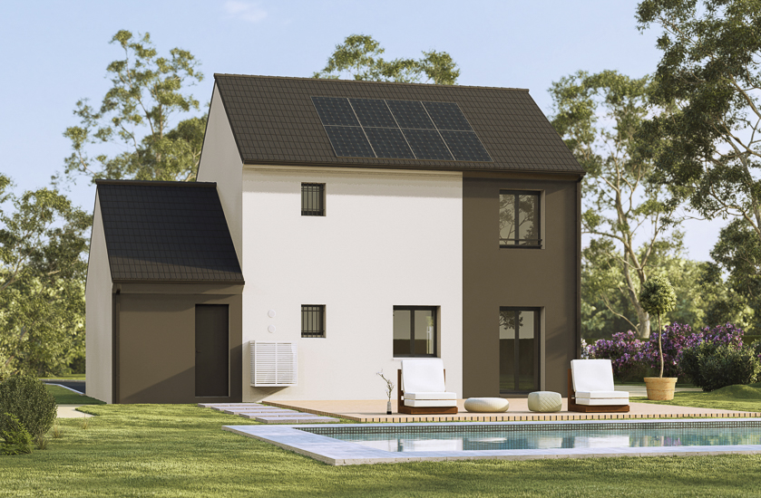 Les menuiseries en aluminium, y compris la porte d’entrée, sont proposées en 5 coloris au choix. La toiture est réalisée en tuiles plates rainurées. Côté façades cette maison dispose de débords de toit en corniches ravalées, de gouttières et descentes de pluie en aluminium gris anthracite. Plusieurs couleurs d’enduit extérieur sont proposés. 2 robinets de puisage, 2 prises électriques extérieures et au minimum 4 points lumineux extérieurs sont également prévus.