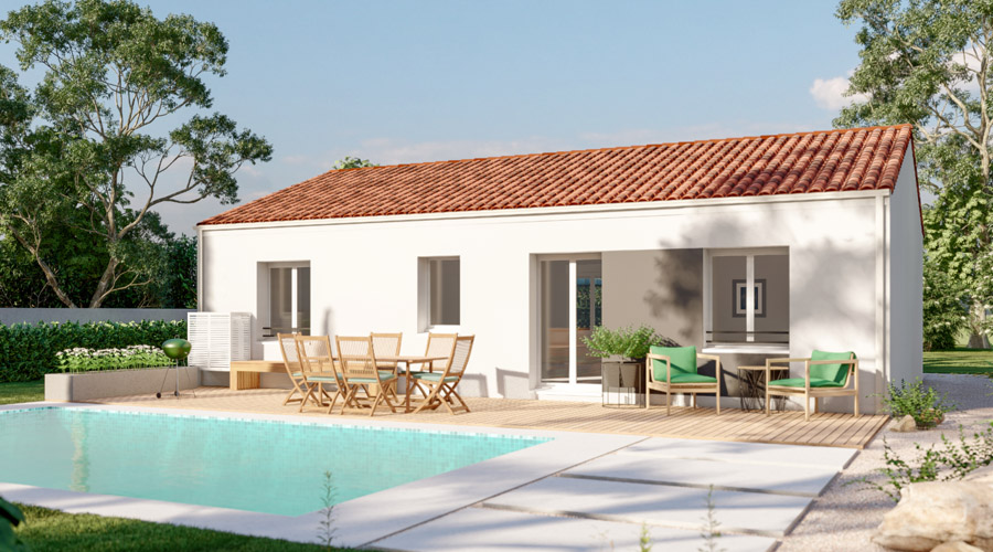 Les menuiseries sont en PVC de couleur blanche. La toiture est réalisée en tuiles béton double romane. Plusieurs couleurs d’enduit extérieur sont proposées.