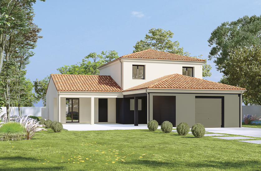 Cette belle maison de 129 m² avec garage intégré est construite sur vide sanitaire. Elle comprend au RDC un vaste séjour lumineux de plus de 39 m², une cuisine spacieuse avec un grand cellier attenant, une chambre avec vue sur jardin et grand WC. A l’étage, 3 chambres, une salle de bains équipée et un WC indépendant. Les plus de ce modèle sont le grand garage de plus de 31 m² et les grandes terrasses couvertes.