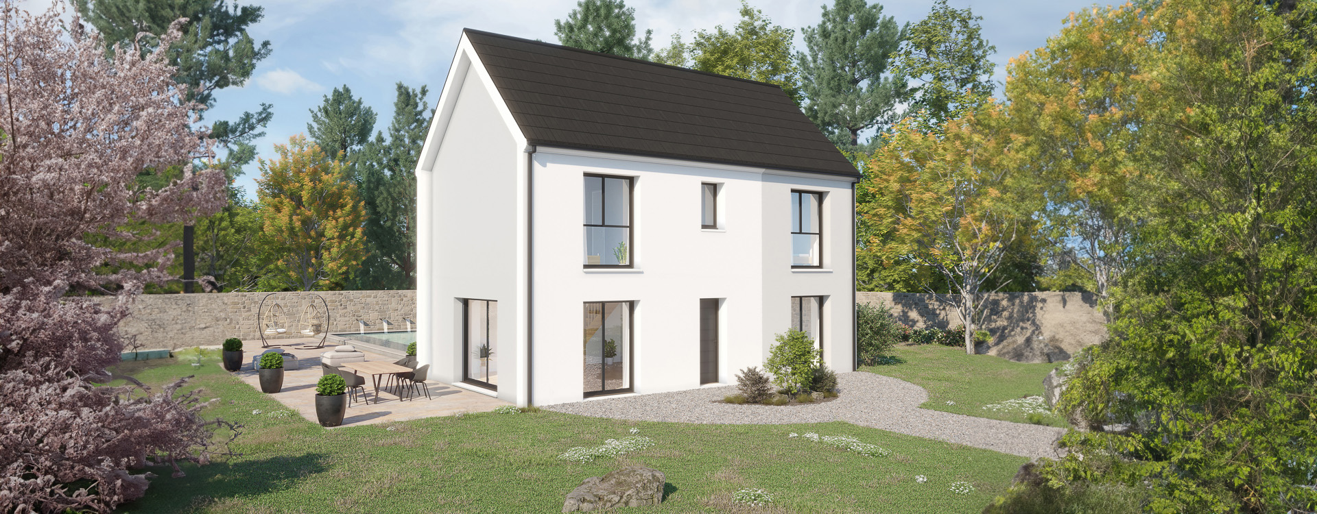 Les menuiseries sont en PVC de couleur blanche. La toiture est réalisée en tuiles béton double romane. Plusieurs couleurs d’enduit extérieur sont proposées.