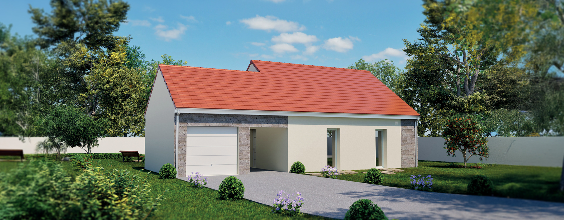 Cette maison de plain-pied à l’architecture moderne est construite sur vide sanitaire. Elle a été conçue par notre bureau d’études de manière à bien séparer l’espace de vie de l’espace de nuit. Pour cela la cuisine a été placée au centre de la maison. D’une surface habitable totale de 116 m², elle dispose d’une entrée généreuse de plus de 7 m² avec un espace de rangements, de 3 chambres, d’une salle de bains avec baignoire et douche et d’un WC indépendant. La cuisine ouverte de 16 m² donne accès à l’espace de vie proposant une surface de plus de 40 m². Le garage intégré de plus de 17 m² est séparé de la maison par un porche de 12 m² donnant accès à la maison. Les menuiseries sont en PVC de couleur blanche. Plusieurs couleurs d’enduit extérieur sont proposées.