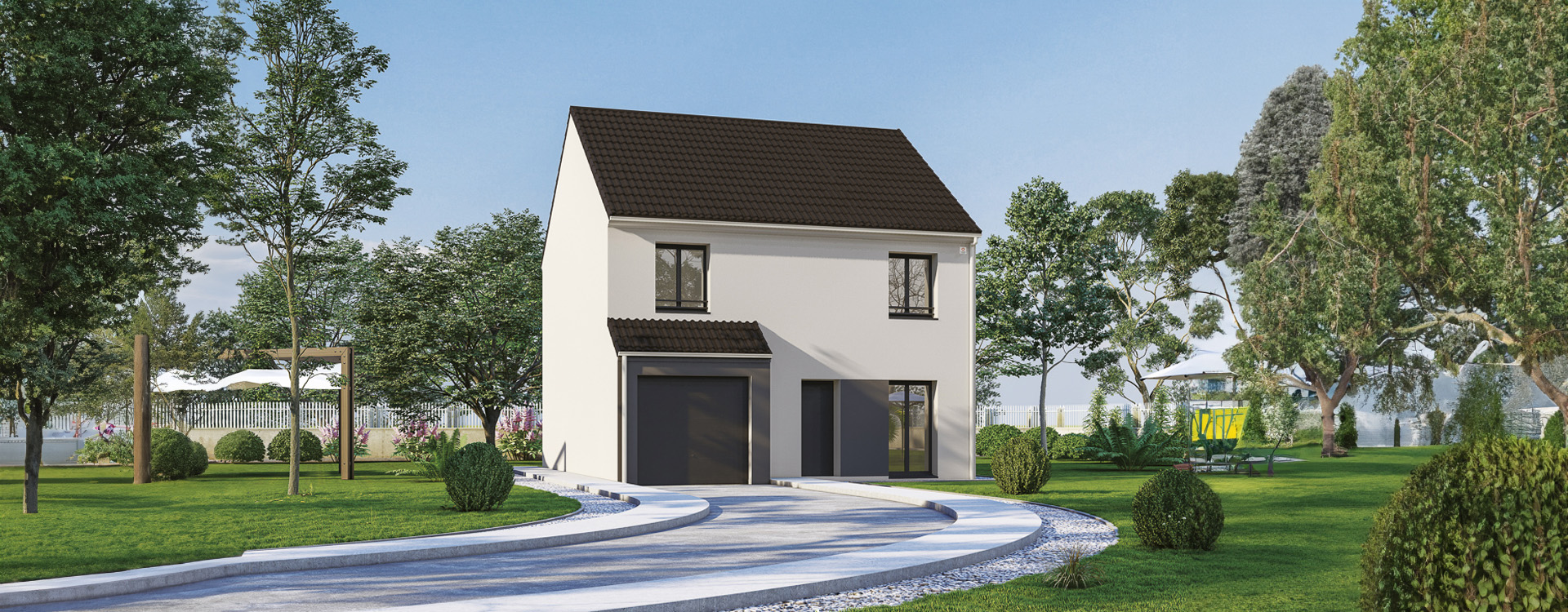 Les menuiseries sont en PVC de couleur blanche. La toiture est réalisée en tuiles béton double romane. Plusieurs couleurs d’enduit extérieur sont proposées.