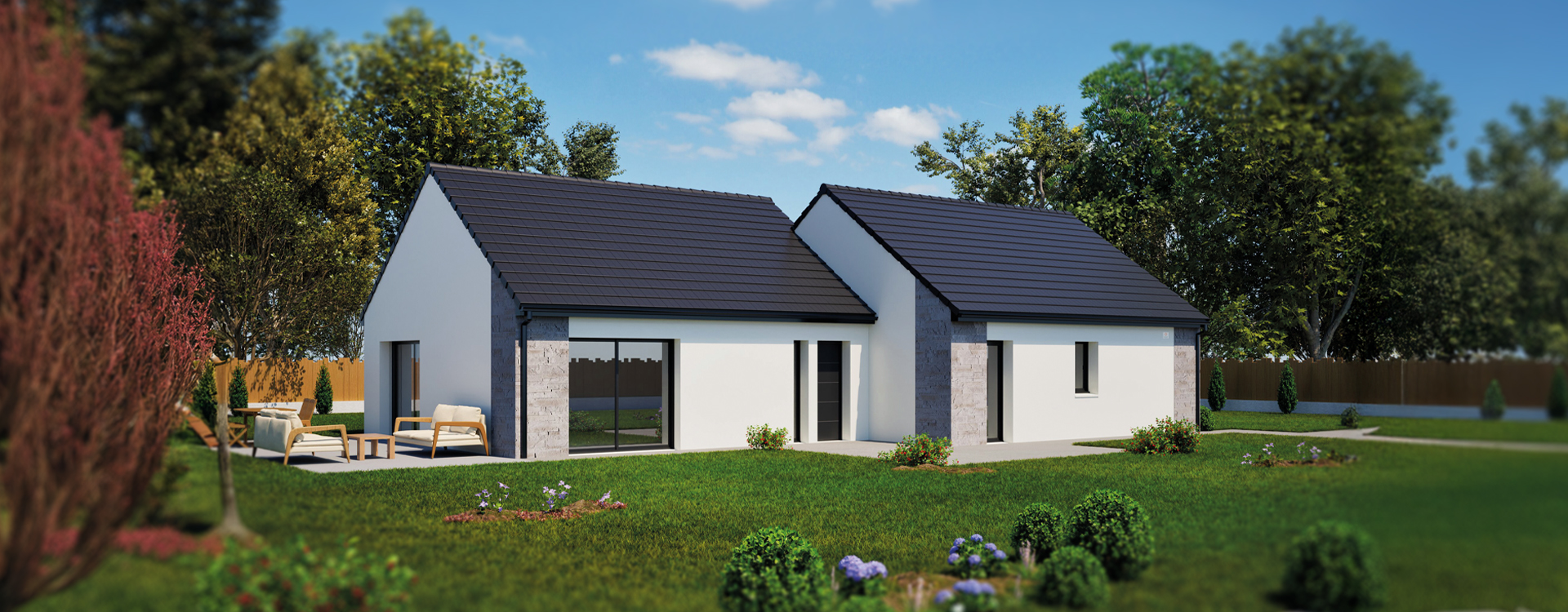 Cette maison de plain-pied à l’architecture moderne est construite sur vide sanitaire. Elle a été conçue par notre bureau d’études de manière à bien séparer l’espace de vie de l’espace de nuit. Le séjour cuisine, très lumineux grâce aux 2 baies vitrées, propose une grande superficie de plus de 55 m². D’une surface habitable totale de 111 m², cette maison dispose de 3 chambres dont l’une avec une salle d’eau privative, d’une salle de bains, d’un WC indépendant et d’un cellier de 6 m². Les menuiseries sont en PVC de couleur blanche. Plusieurs couleurs d’enduit extérieur sont proposées.