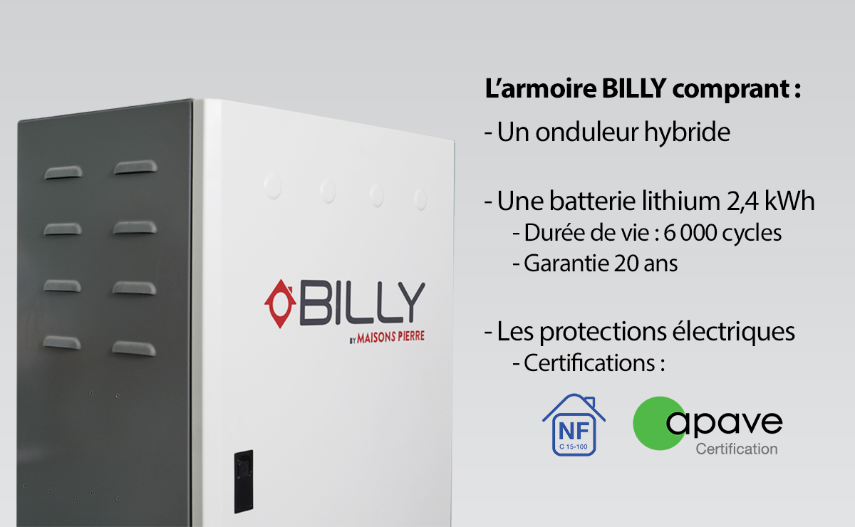 Opération nationale exclusivement réservée à la marque Maisons Pierre et mise en place dans les agences participantes* à l’opération, non cumulable avec d’autres promotions en cours et dans la limite des stocks disponibles. Offre comprenant la livraison, la pose et le raccordement de 6 panneaux photovoltaïques et d’une batterie de stockage de 2,4 kWh (Armoire Billy), dans la limite du budget établi (prise en charge à hauteur de 12 900 € TTC maximum – Prix public).